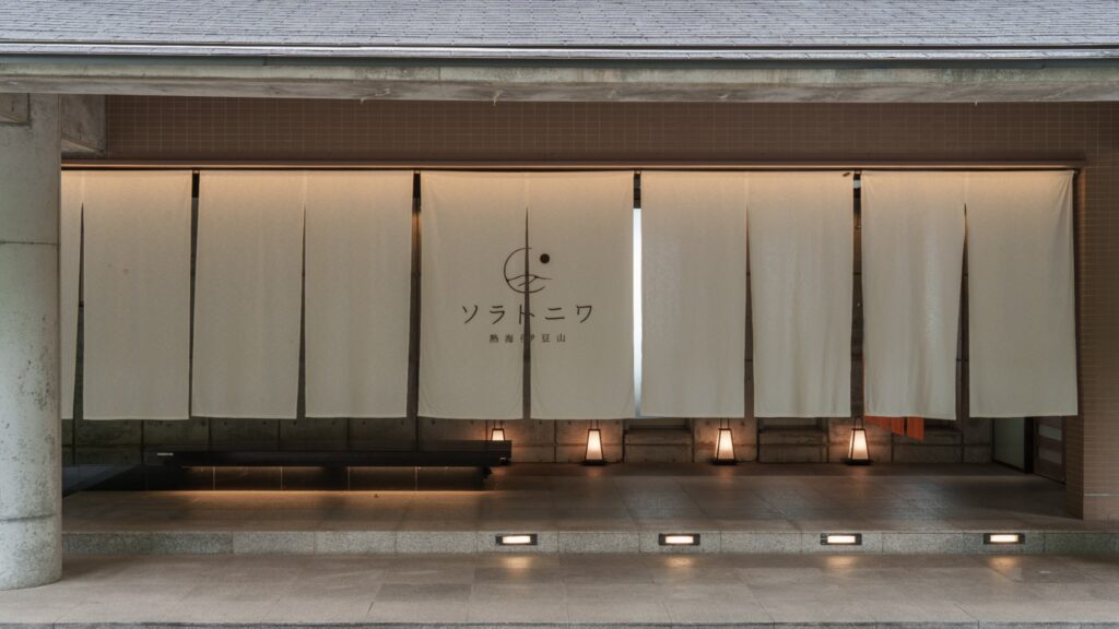 2025年10月、旧「ゆとりろ熱海」から「ソラトニワ熱海伊豆山」としてリニューアルオープン。伊豆山の高台に位置し、相模湾と初島を一望できる絶景ロケーションに、足湯カフェラウンジ・瞑想サウナ・夜の〆パフェBarが全部込みで付いてくる、熱海エリアで新しいオールインクルーシブ体験を楽しめる宿です。「景色の中でととのう時間を買う」——それがこの宿のコンセプト。カップルや夫婦で、「温泉に入って、ラウンジで飲んで、サウナでととのう」を繰り返すホテルステイを楽しめます。2026年3月にはプライベートサウナ・BBQ・焚き火が楽しめる「ソラトニワ別邸」もオープンし、選択肢が広がったのもポイント。