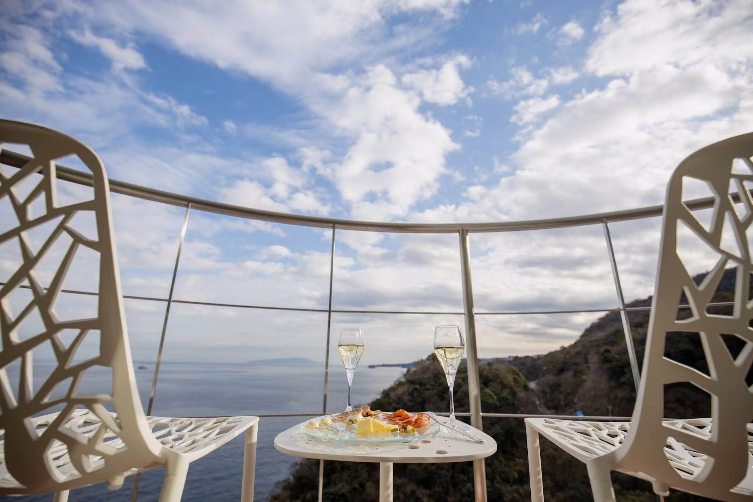 - バルコニー(インガーデン)でオーシャンビューとスパークリングワイン:客室テラスから相模湾が一望できる。チェックインから夕食まで、テラスで飲みながら夕焼けを眺める時間はたまりません。