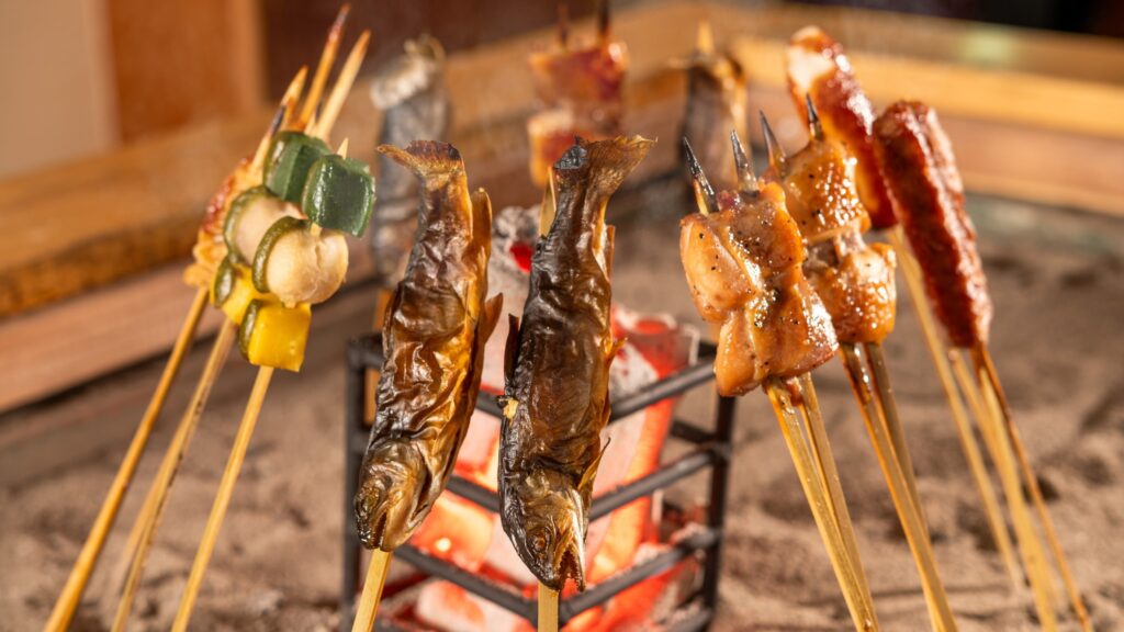 • 囲炉裏レストランで夕食(飲み放題込み):生ビール・スパークリングワイン・栃木の地酒・ワイン・焼酎等が飲み放題。串焼きを焼きながら飲む体験は、バイキング系とはまったく別物。