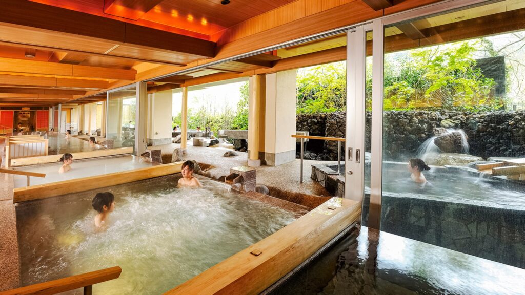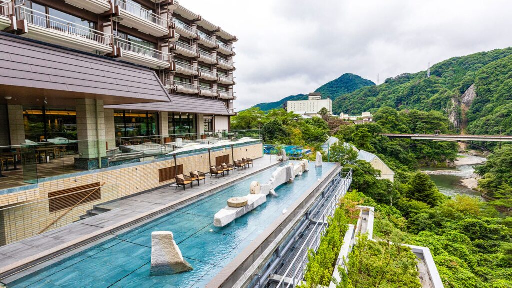 • 大型施設で設備が充実:大浴場は川沿いで渓流を感じる設計。規模感があるため1泊で温泉を満喫できる。